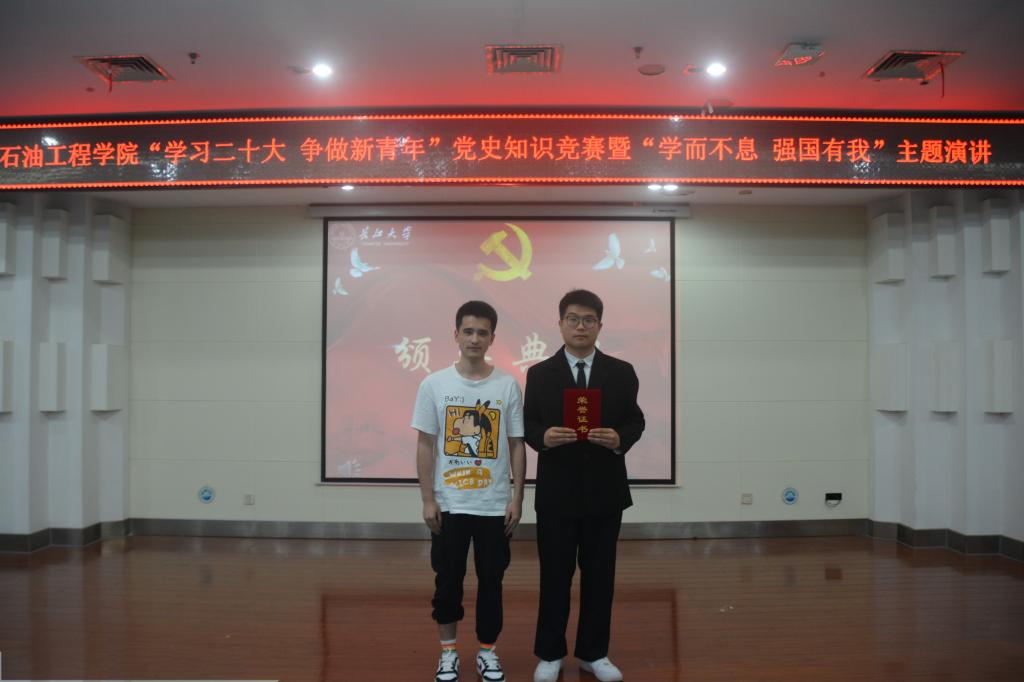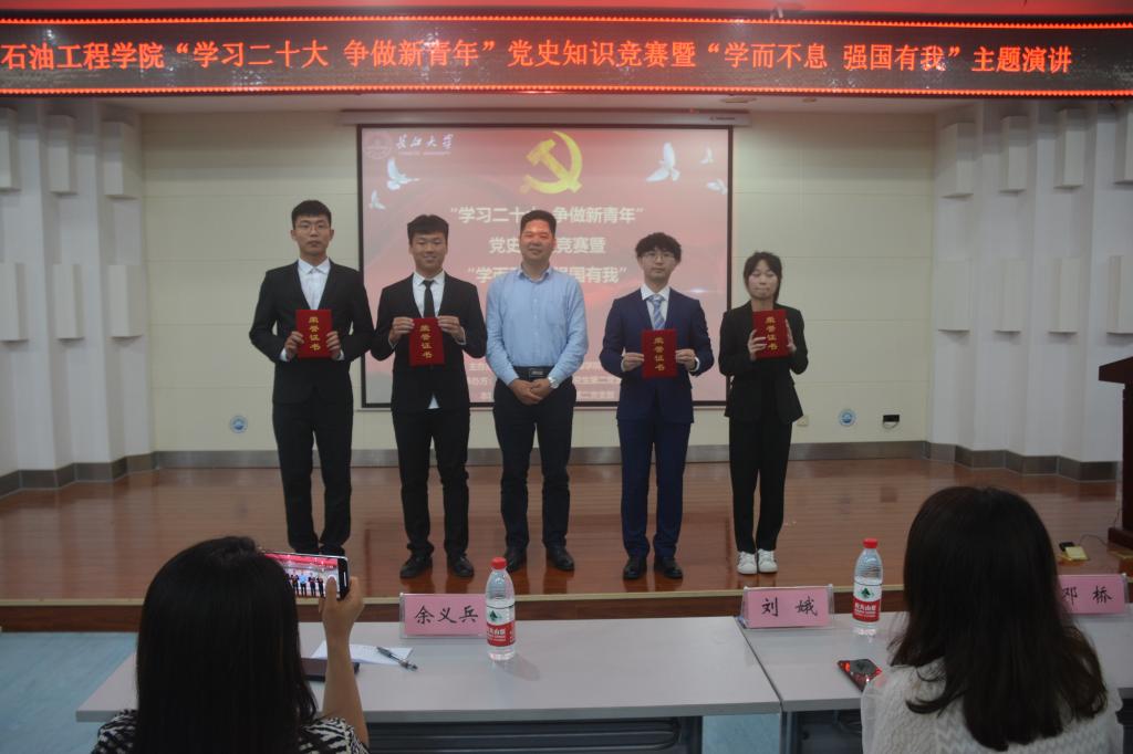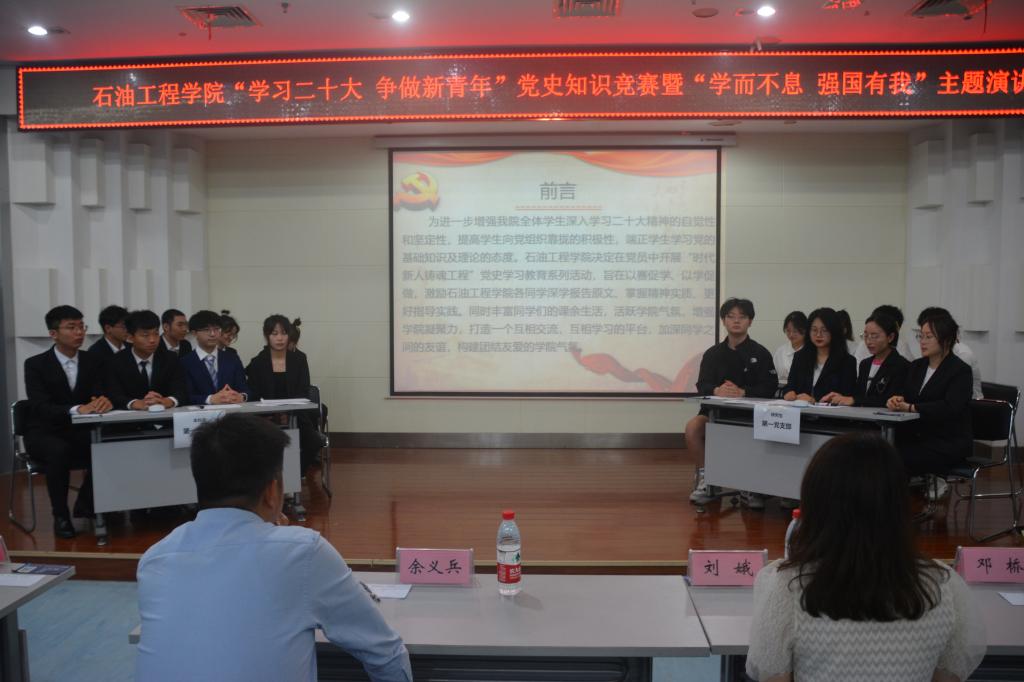 (通讯员 王雪瑶/文 刘科技 刘昕竹/文)2023年04月20日18:00,williamhill中文于图书馆报告厅顺利开展“学习二十大 争做新青年”党史知识竞赛暨“学而不息 强国有我”主题演讲活动。学院党委副书记刘娥、油气井工程系教工党支部邓桥、余义兵,学工办史永波、郭冀宁、周晓峰、陈金建老师莅临本次比赛现场。