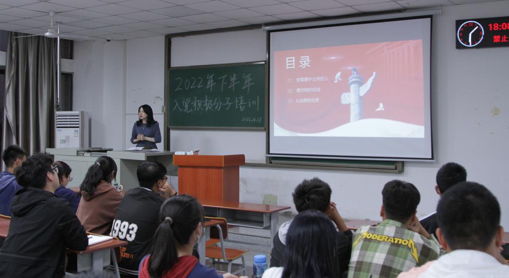 (通讯员 刘昕竹/文 赵臻浩/摄)2022年10月18日晚上6时,williamhill中文在武教A310开展了入党积极分子培训,院党委副书记刘娥讲授“青春心向党,争做‘党’中人”主题党课,85名入党积极分子参加。