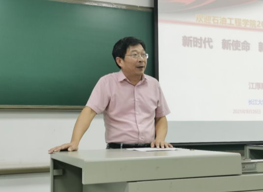 2021年9月26日晚,院长江厚顺以“新时代 新使命 新作为 新担当”为主题,从“国家能源重大需求、石油精神与文化、学院基本情况”三个方面为2021级新生上了一堂形势与政策课,引导广大石油学子立志“担时代之重任,创能源之强国”。