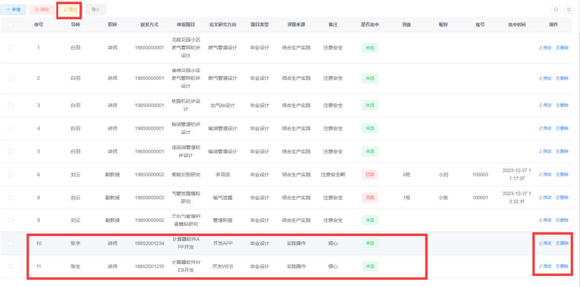 针对本科毕业设计选题环节存在的流程繁琐、匹配效率低等问题,支部主动作为,由系主任张兴凯老师组织3名经验丰富的党员教师组建研发小组,历时30天自主研发williamhill中文本科毕设选题系统。该系统覆盖油气储运、石油工程等4个专业,可满足每年500余名本科生的毕业设计选题需求,充分考虑了不同专业的毕业设计特色与需求。