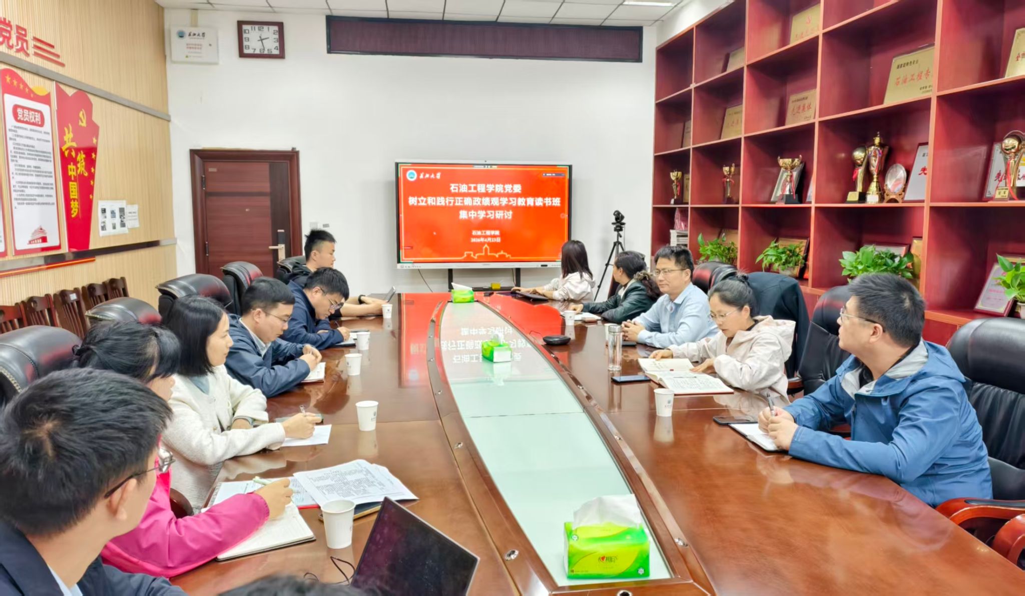 4月23日下午,williamhill中文党委理论学习中心组在石油科技大楼C111会议室开展2026年4月集中学习暨树立和践行正确政绩观学习教育读书班第五次专题学习研讨。学院党委书记张伟主持,学院中心组成员、各中心主任参会。