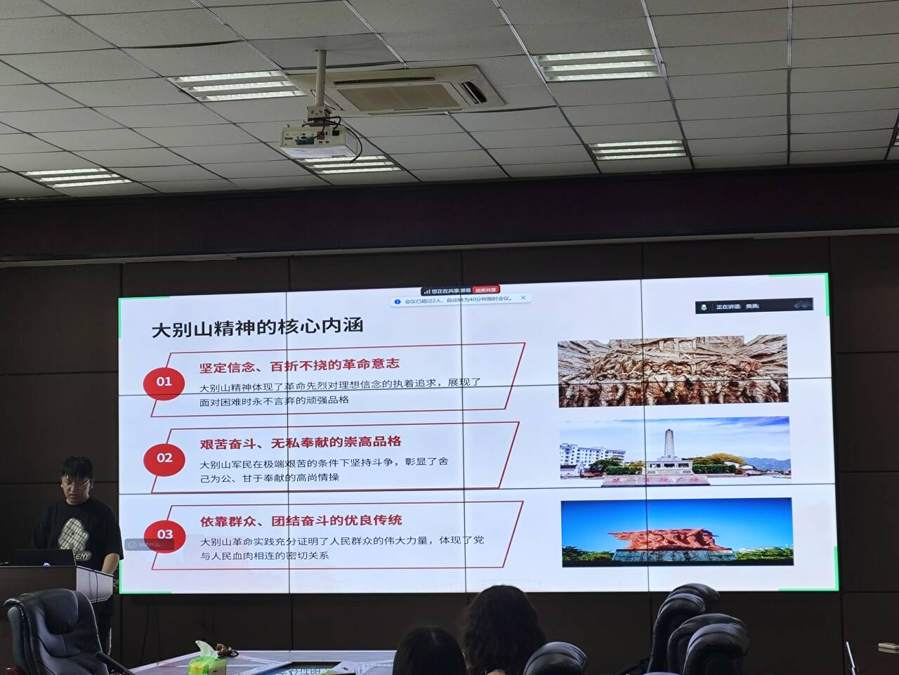 接着,由袁海一、王泽润同志讲授微党课。首先,他们指出“三大精神”是中国共产党在不同历史时期形成的伟大精神,它们体现了中国共产党人的高尚品质和崇高精神追求。随后分别对“大别山精神”、“抗洪精神”、“抗疫精神”的核心内涵和社会价值进行详细阐述,展示了中国共产党人精神谱系的重要组成,最后总结“三大精神”历久弥新,强调作为共产党员,要深刻领悟“三大精神”的内涵,将其融入到我们的日常生活和工作中,以实际行动践行社会主义核心价值观。