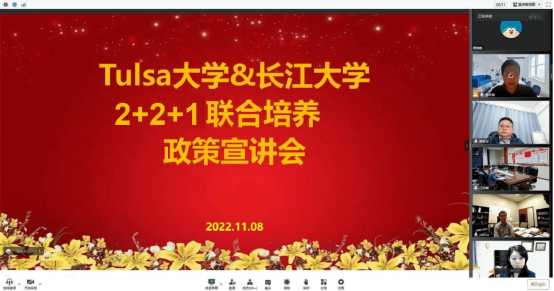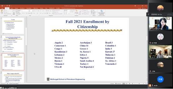 (通讯员 成雨音 周晓峰)11月8日晚9时,威廉官网中国与美国Tulsa大学“2+2+1”联合培养项目线上宣讲会顺利举行,Tulsa大学全球事务副校长Vivian Wang、Jun Lu博士,我校国际交流与合作处处长曾亚军,williamhill中文院长江厚顺、副院长李忠慧、张菲菲、院党委副书记刘娥参加活动,李忠慧副院长主持。石油工程专业2021级和2022级学生共计270余人报名参加了本次宣讲会。