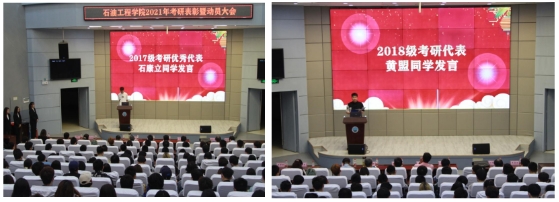 2017级考研优秀代表石康立同学上台分享了他的考研心得:准确掌握考研信息,科学制定复习计划;均衡各科复习,力求补短板;保持积极心态,坚持计划,行百里者半九十。他提到疫情虽然对备考有一定的影响,但只要坚持就能看到曙光。“一切目标最终达成的源头,都始于自己心中的那团‘火’,也就是我们惯常所称的‘决心’。我相信,当大家冒起那团‘星星之火’时,并且持续努力付诸实践践行时,大家就离自己美好的未来不远了。”油工(中俄)21801班黄盟同学代表全体2018级本科生表明决心,呼吁大家一起勇敢追梦。