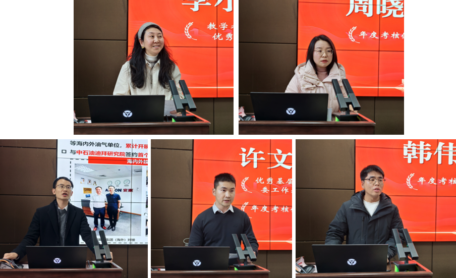 先进个人代表周玉辉、许文俊、李小艳、韩伟伟、周晓峰依次上台发言,分享了各自在基层党建、科研创新、教育教学、公共事务、管理服务方面的心得与感悟,表达了对学院培养的感激之情和继续投身学院改革与事业发展的决心。