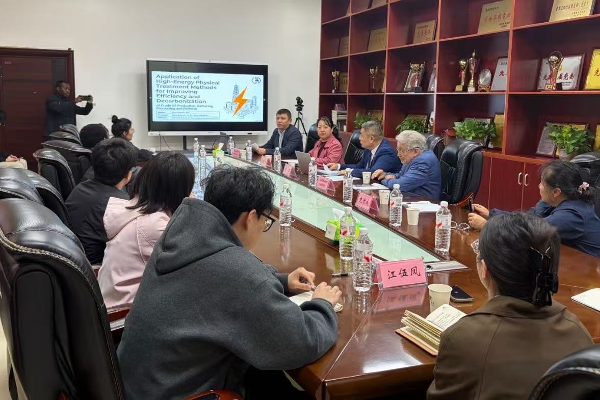 Ramil院士带来题为“Application of High-Energy Physical Treatment Methods for Improving Efficiency and Decarbonization of Crude Oil Production, Gathering, Processing and Refining”的学术报告。报告围绕“双碳”战略目标,从高能物理技术这一前沿切入点展开深入剖析,系统介绍了该技术在油气行业节能降耗、资源高效开发与绿色转型中的关键作用与创新应用。结合国际前沿动态与工程实例,重点展示了团队在利用等离子体、电磁场等方法实现原油重质组分裂解、降粘与脱碳的最新突破。