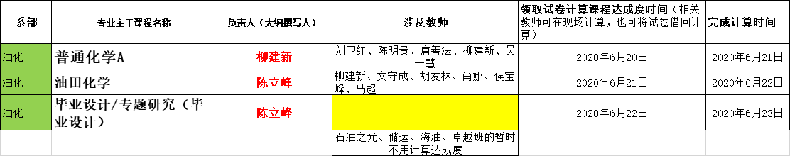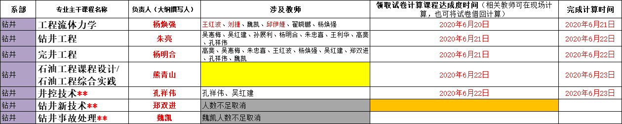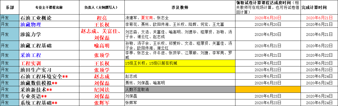 根据2020年6月16日专业认证推进会会议决定,我院石油工程专业19门课程的达成度计算由相关课程任课教师负责,各系主任(钻井系熊青山教授、开发系张顶学教授、油化系付美龙教授)负责落实安排具体完成教师,完成达成度计算的截止时间为6月24日。相关课程、课程大纲撰写人、授课教师名单、领取试卷时间安排等见附件。