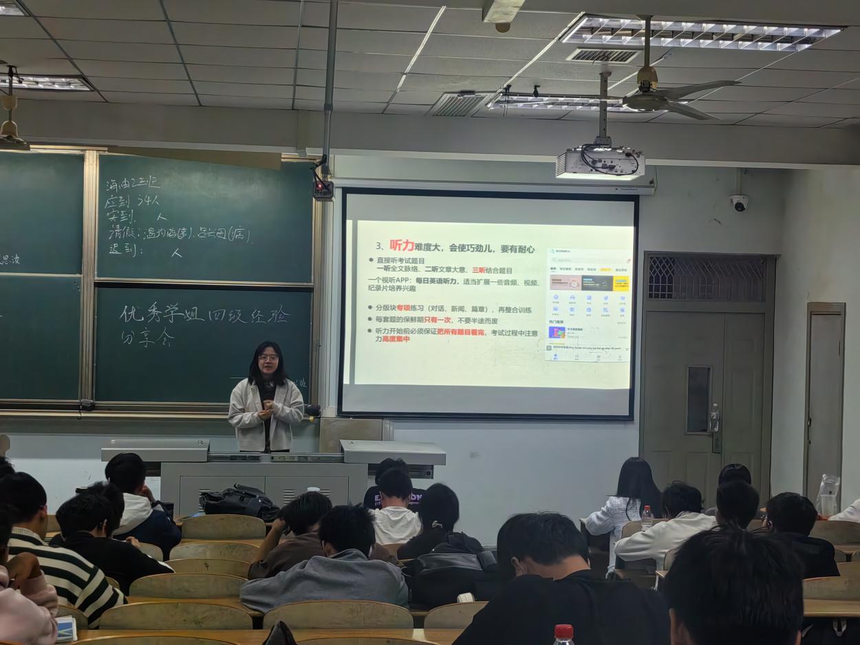 (通讯员 谭钧尹)为了让同学们更好的掌握学习英语的方法并有效的备战英语四级考试,我院24级新生于11月5日举办“优秀学姐四级经验分享会”,本次英语四级经验分享会邀请到班主任方含之老师,熊雪景、张美晨两位学姐,海油1、2班全体同学参与。 活动伊始,熊雪景学姐走上讲台,她强调四级和绩点的重要性。四级考试不仅是对大学生英语综合能力的一种检测,而且也是现在大学生高质量就业的基本条件。绩点同样至关重要。绩点是对学生学业成绩的量化体现。在大学的评优评先中,绩点往往是首要的衡量标准。高绩点的学生更容易获得奖学金、荣誉称号。在学习方面,熊雪景学姐强调了时间管理的重要性。她指出,大学的学习生活丰富多彩,但也充满挑战,合理安排时间是取得优异成绩的关键。 接着,张美晨学姐为我们带来了丰富的四级经验。首先,她向我们强调了词汇是英语学习的基本,可以使用四级词汇书或者手机APP,要坚持、充分利用碎片化的时间,及时巩固、刻意联想。接着,她向我们介绍了阅读的方法:循序渐进、熟能生巧。学姐强调,带着问题读文章是非常高效的做题方法,而挑选合适的难度和感兴趣的文章更容易坚持下去。最后学姐向大家介绍了大家最头疼的听力部分的做题方法,她提到“听力难度大,要会使巧儿,有耐心”,她建议直接听考试听力并至少听三遍:一听全文脉络、二听文章大意、三听结合题目,她强调在听力开始前必须保证把所有的题目看完,考试过程中注意力高度集中。 通过两位学姐的经验分享,大一的同学们收益颇深,对大学的英语学习有了更清晰的认识和规划,相信同学们在今后的学习中,能够结合自己的实际情况,制定出适合自己的学习和发展计划,在大学这个充满机遇和挑战的舞台上绽放出属于自己的光彩。 【审核:周雨薇】
