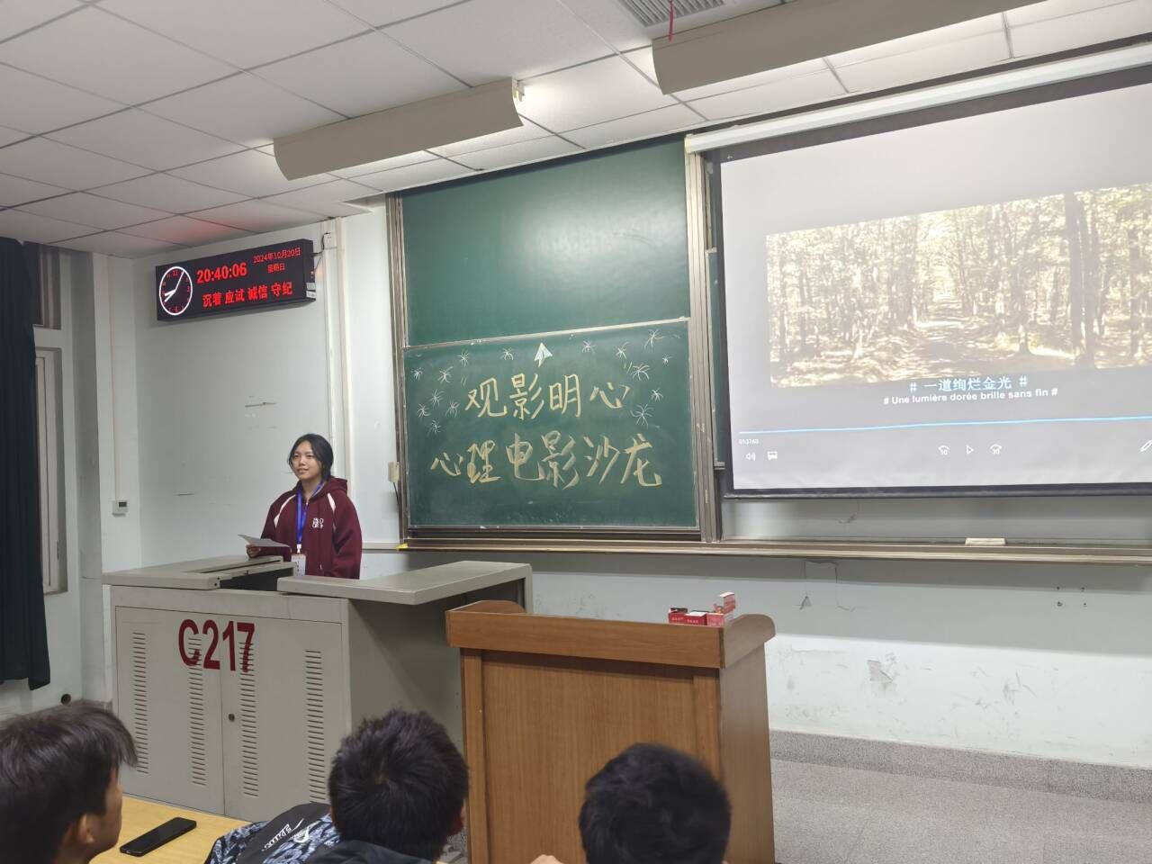 (通讯员 刘明晖 王天雨/文 舒晓宇 樊祥喆/摄)10月20日晚,油工学院在东校区13教c217举办学院心育特色活动——观影明心心理电影沙龙。本次播放的电影是《放牛班的春天》,由心育部的学生干部带领同学们在电影中感受音乐对心灵的治愈,活动由储运12401班苏辰宇主持,共70名学生参加。