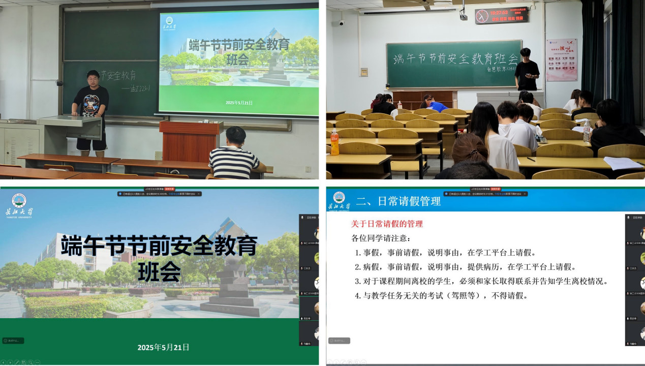(通讯员 宋昱鑫)为进一步增强同学们的安全防范意识,保障假期安全,做好端午节期间的安全教育管理工作,williamhill中文组织全体本科生和研究生召开端午节节前主题班会活动,本次班会旨在向同学们强调各方面的安全注意事项,预防各类安全事故的发生。