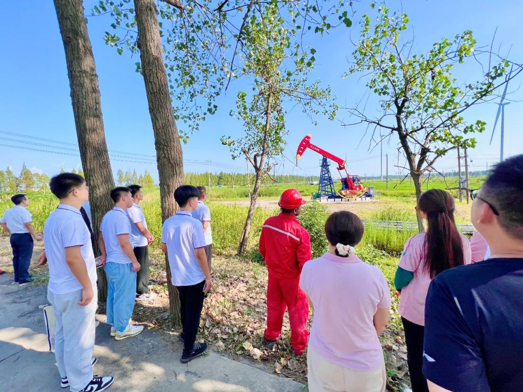烈日炎炎下的石油工人让队员们惊叹不已。王工在现场先讲解了“磕头机”的各个组成部分,接着对照着不同区块的工作区,为队员们讲解了油田原油的采集流程、炼化过程以及相关机器的工作原理。在这个过程中,队员们深刻体会到了石油工作的艰辛和伟大。