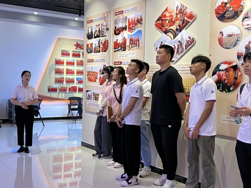 旧址外红砖上所展示的油田历程使实践队成员为之震撼、钦佩——1965年9月喜获自喷工业油流;1969年8月成立江汉石油勘探会战指挥部;1971年5月喜获工业气流,建南气田发现;1972年5月会战结束,建成两个百万吨,江汉石油管理局成立;1977年12月江汉油田原油年产量首次超过100万吨;1986年7月跨省承包八面河油田,首开石油工业跨省承包先河;1990年10月盐化工总厂开工奠基;1998年3月与长庆油田签订合作开发坪北油田协议;2000年2月江汉石油管理局重组改制,成立江汉油田分公司;2011年12月江汉石油管理局荣获“全国文明单位称号”;2012年12月江汉油田承担涪陵页岩气田开发建设任务;2012年12月中国石化实施专业化重组,工程、机械板块从江汉油田分离……
